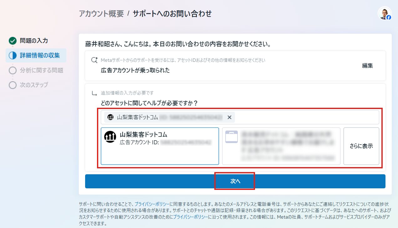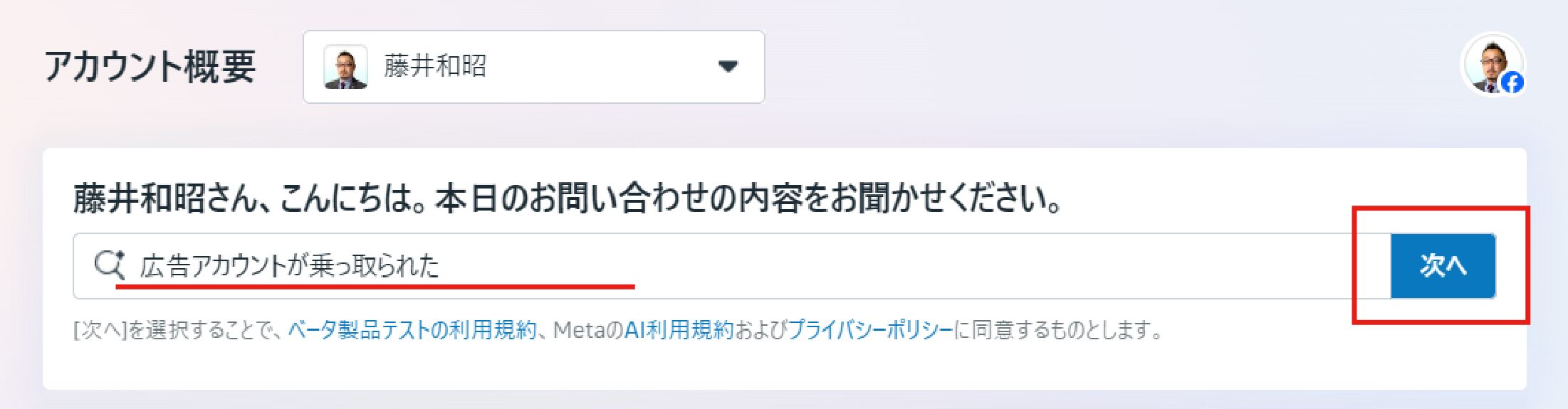 お問い合わせ内容を聞かせてくださいという欄に「広告アカウントが乗っ取られた」「広告アカウントが凍結された」等の状況を入力し「次へ」をクリックします。