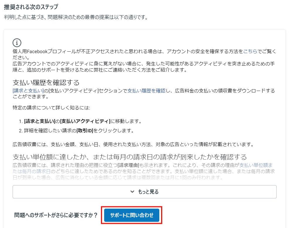 「推奨される次のステップ」と表示されたら、下部の「サポートに問い合わせ」をクリックします。